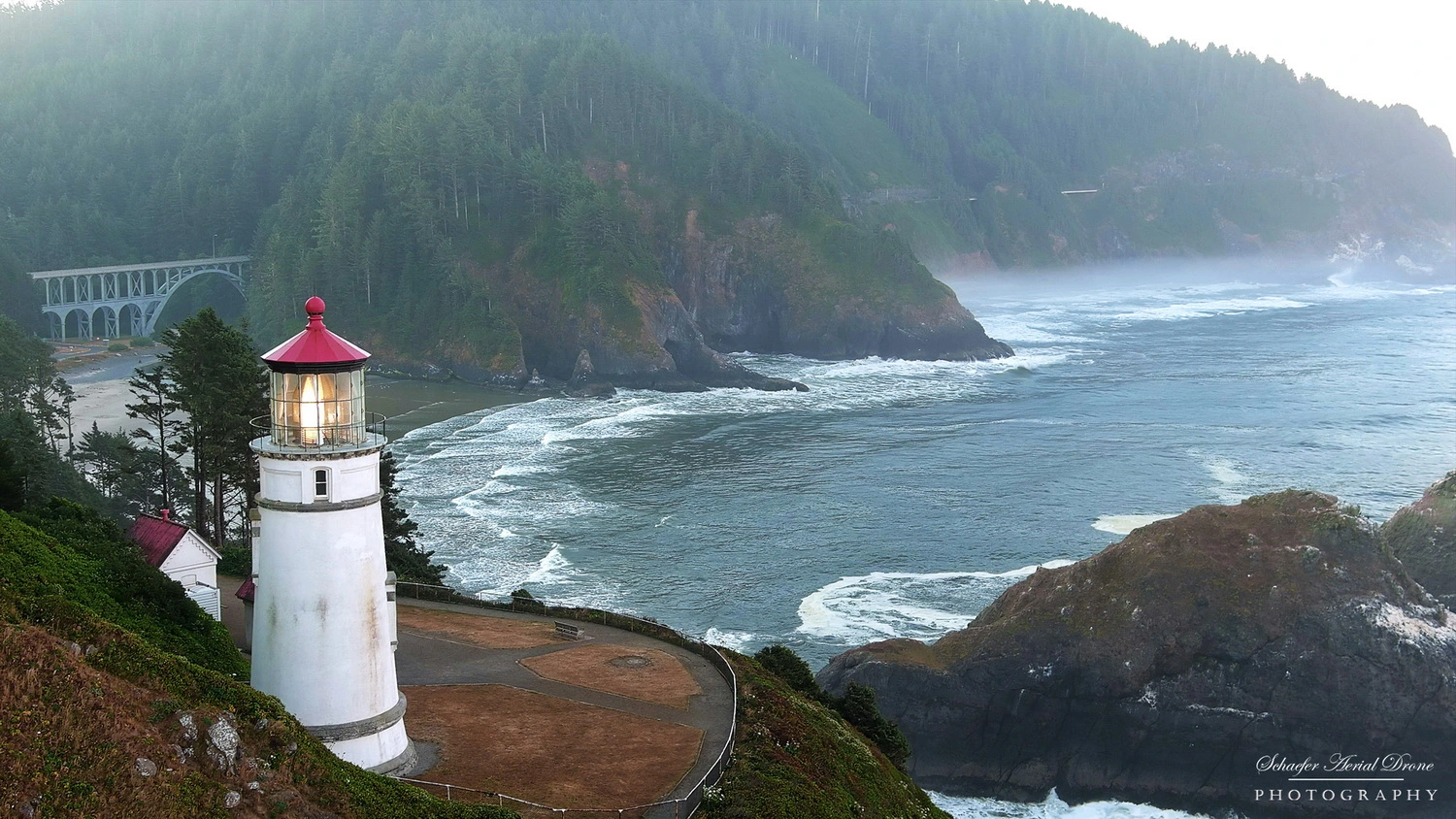 This was a beautiful morning in late August on the Oregon coast. The sun was just rising behind the drone and it lit up the rolling waves. As you can see, there was a fog bank off the coast which had some interesting colors. None of this would look as good if not for the deep blue color of the water.